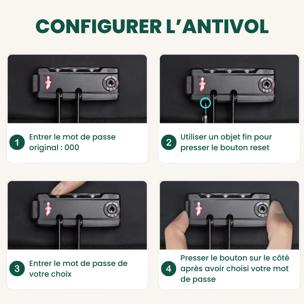 Grâce à son système d'antivol à 3 chiffres, voyagez l’esprit tranquille. Ni voleurs à l’arraché, ni curieux n’auront accès à vos effets personnels, et votre code personnel reste facile à modifier à tout moment pour une sécurité toujours optimale.